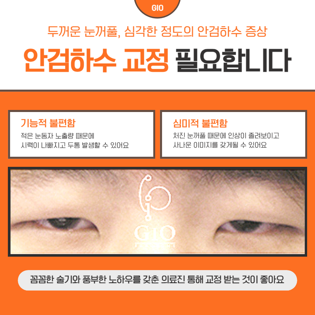 - 교정 효과가 전혀 나타나지 않아 여전히 심한 안검하수 나타내는 저교정