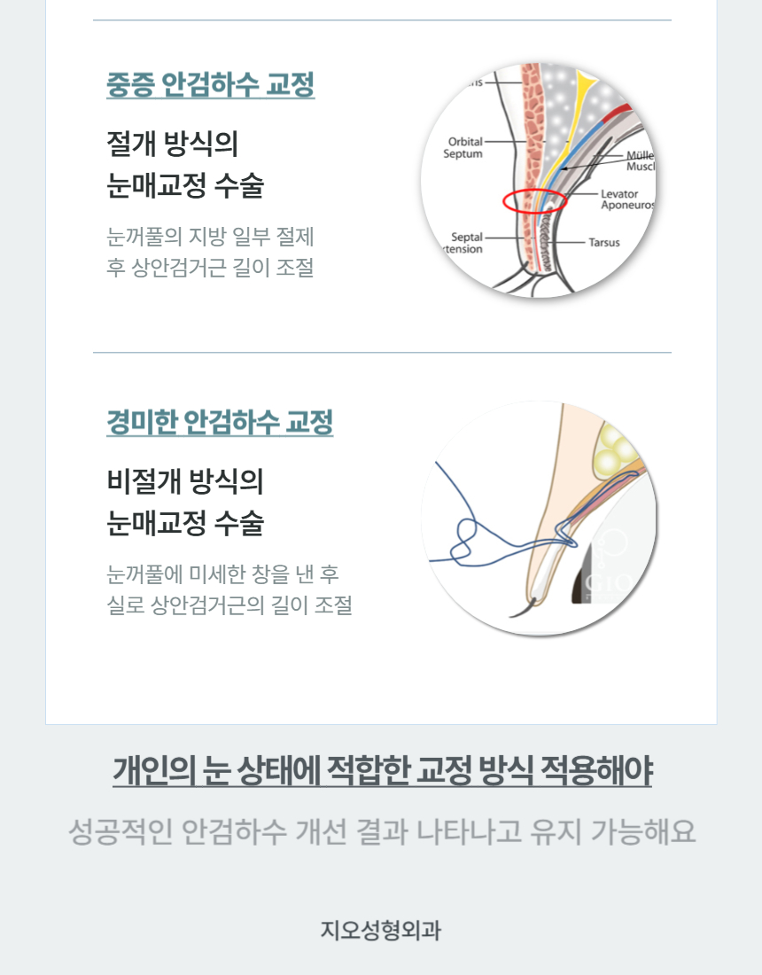 안검하수 증상이 심하고 눈꺼풀이 두꺼운 경우에는 절개 방식으로 진행하며,