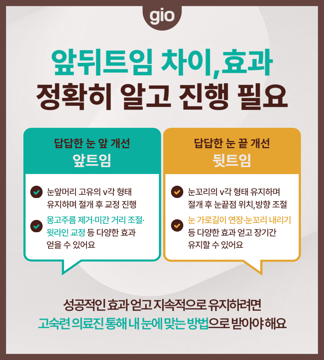 앞뒤트임은 눈의 앞머리와 뒤쪽을 절개하여 동공 양옆의 흰자 여백을 넓히고,