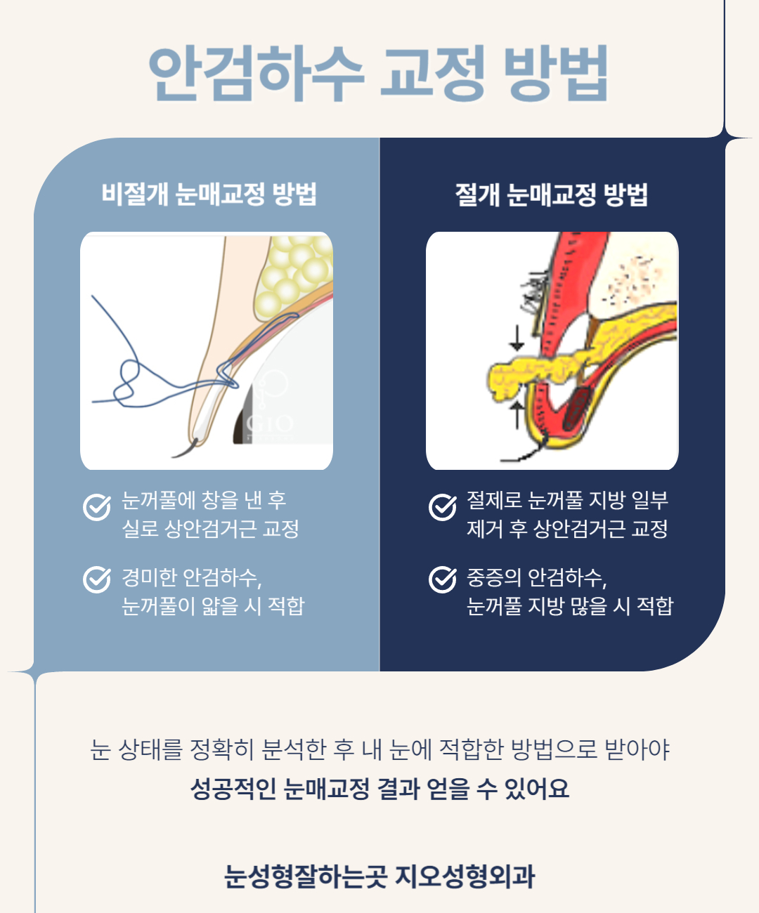 - 눈꺼풀에 지방이 많거나 피부가 두꺼운 경우 → 절개 방식 권장
