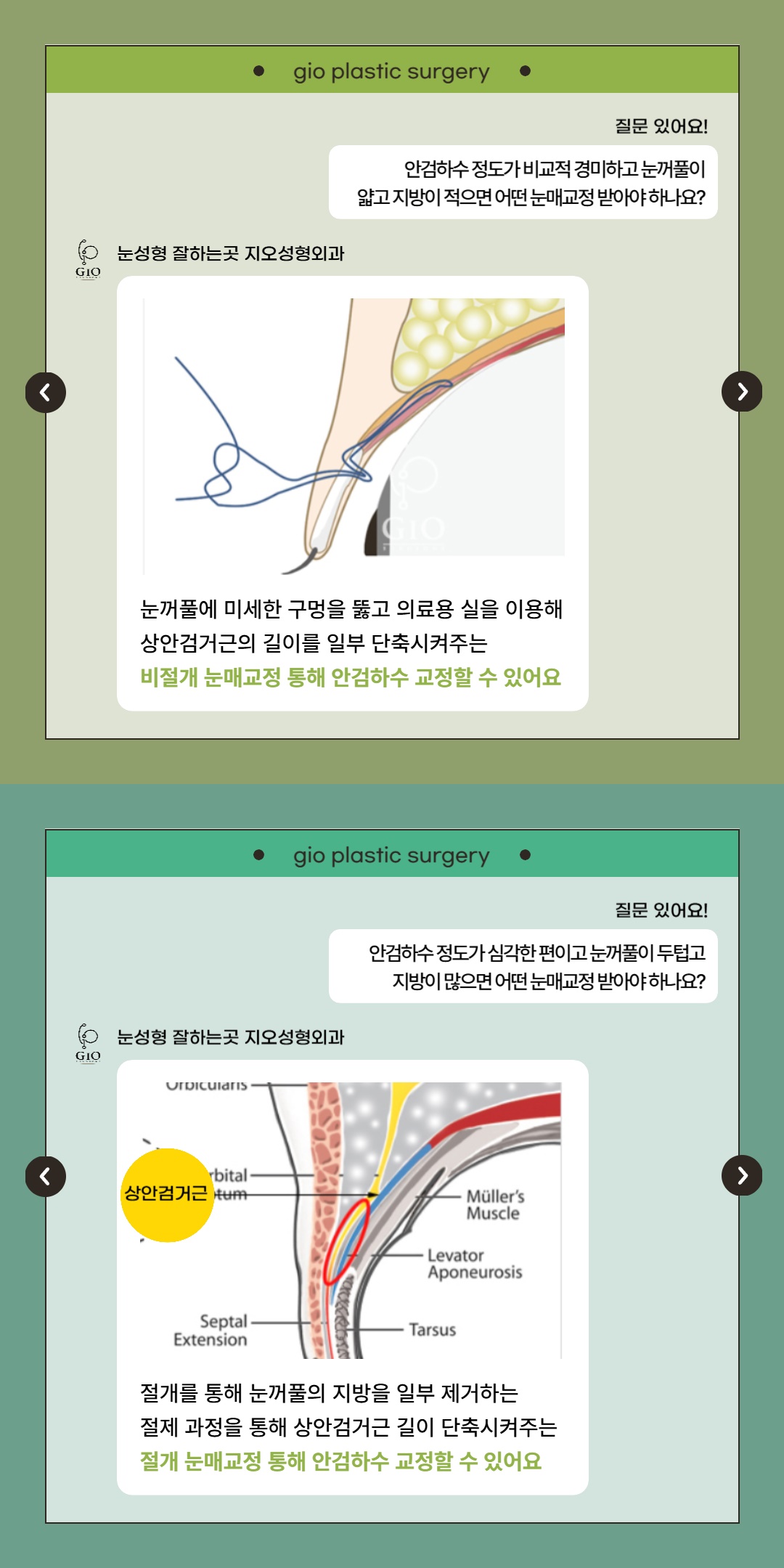 - 실을 이용해 상안검거근의 길이를 조정하여 눈매를 교정하는 방법으로, 흉터 걱정이 적고 회복도 빠릅니다.