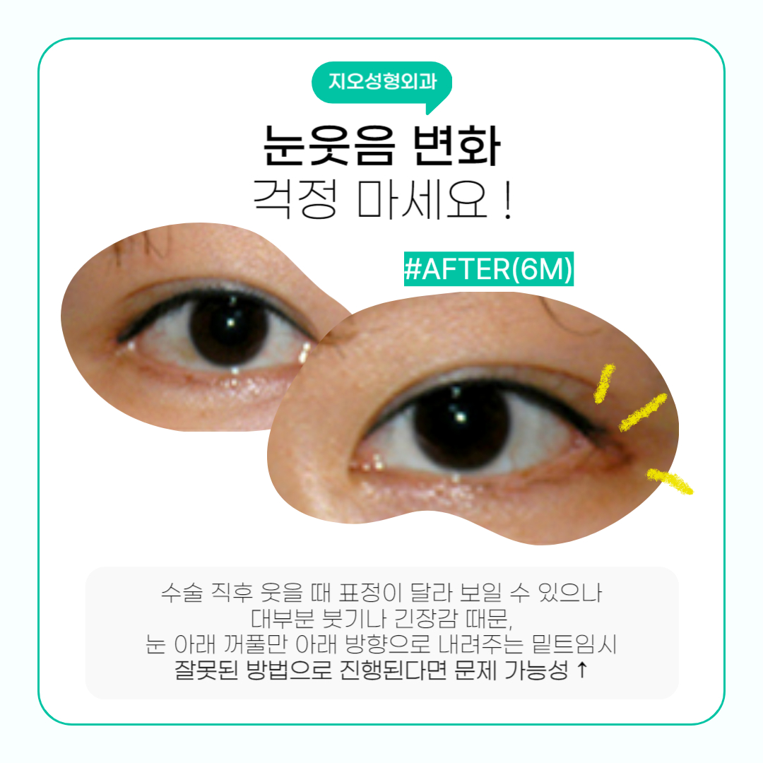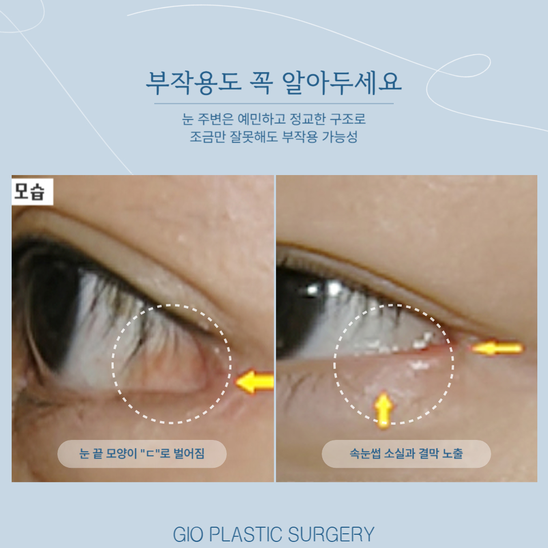눈꼬리 모양이 부자연스럽게 변하거나 벌어짐, ㄷ자 형태로 자리 잡는 등의